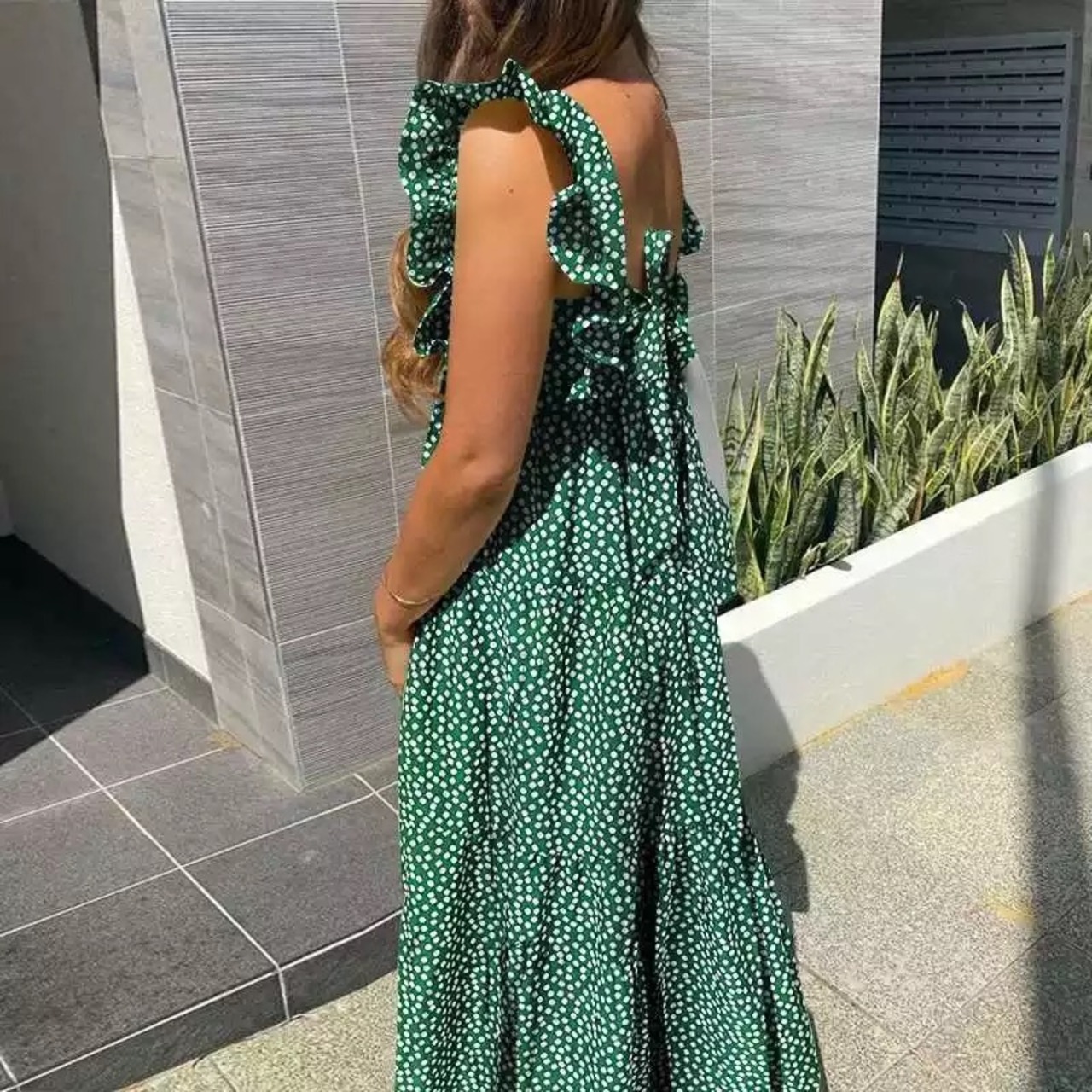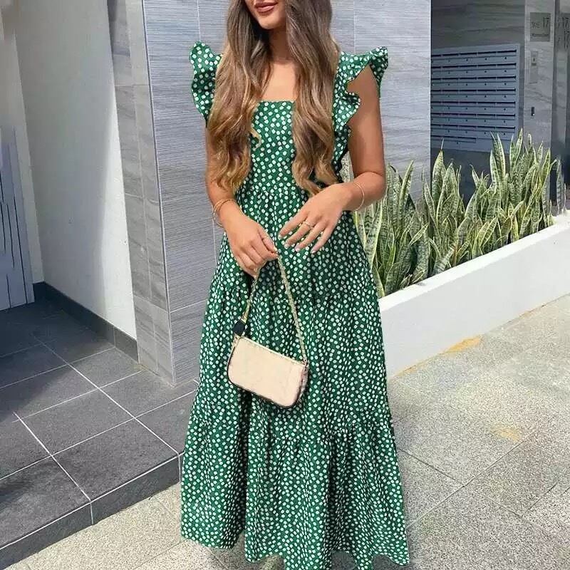 フリルバックデザインリボンワンピース フラワー小花柄 グリーン