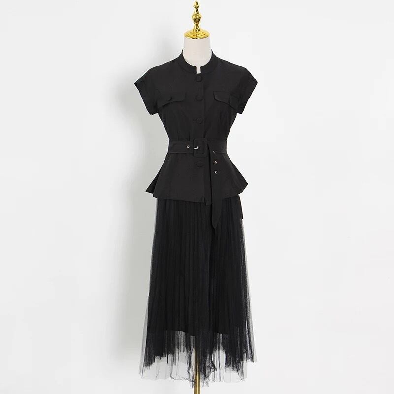 長袖ウエストベルトミドル丈プリーツワンピース ブラック