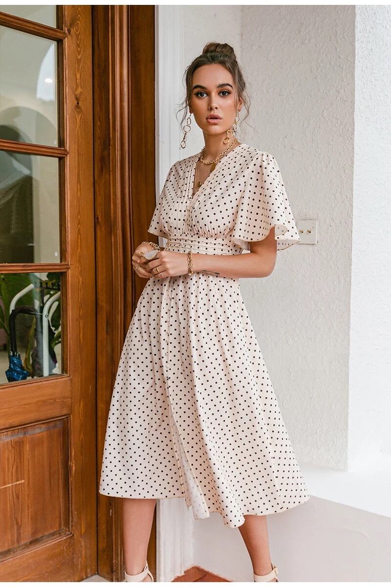 S:胸囲96、ウエスト周囲65、ヒップ周囲123、背中中央長さ118、裾周囲219、袖長さ26 M:胸囲100、ウエスト周囲69、ヒップ周囲127、バックミドルレングス120、ヘム周囲224、スリーブ長27 L:胸囲104、ウエスト周囲73、ヒップ周囲131、レングス122