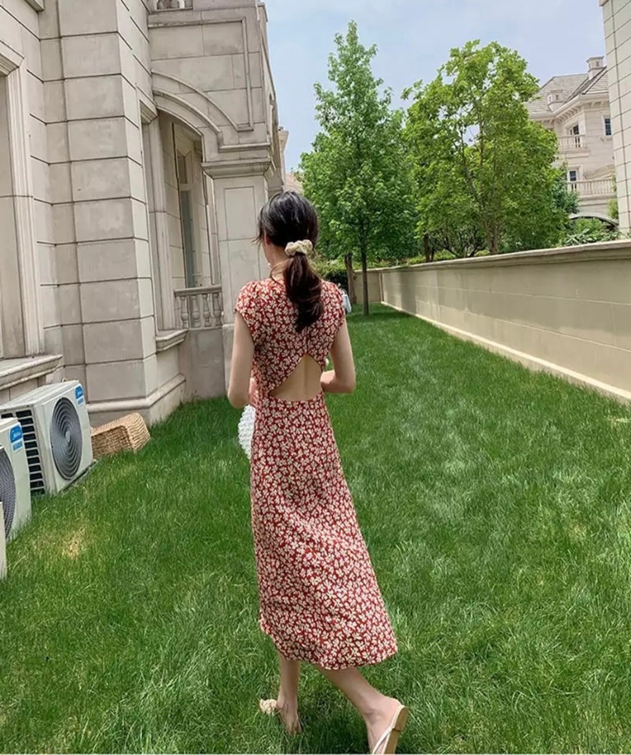 フラワーデザイン背中側がオープンデザインの花柄ワンピースです