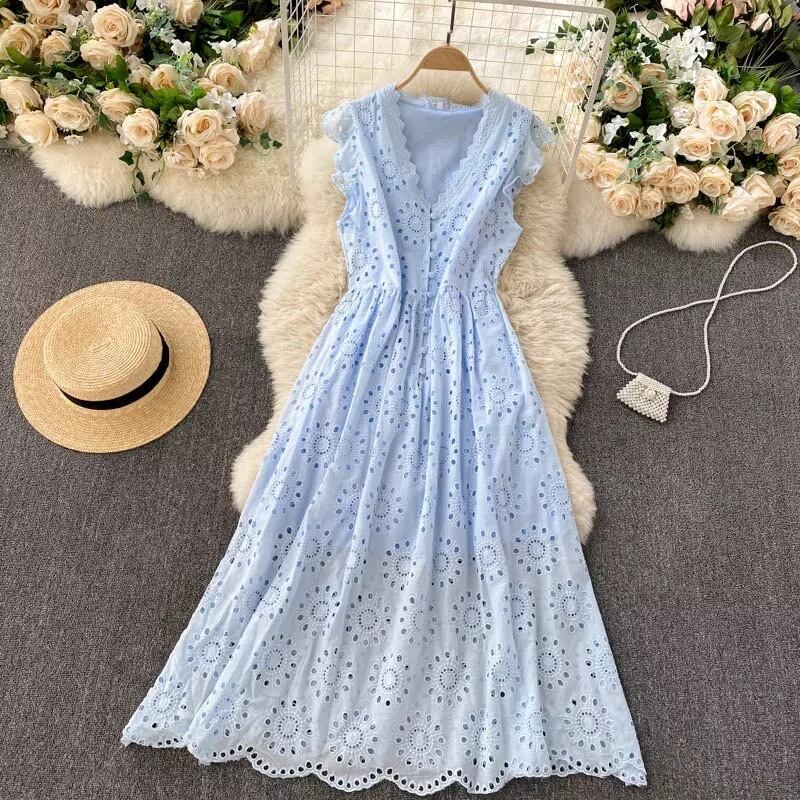 Vネックレースホールデザインワンピース ブルー