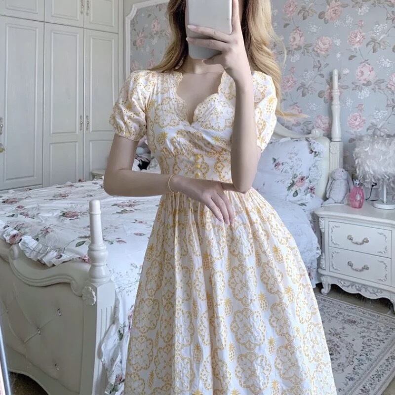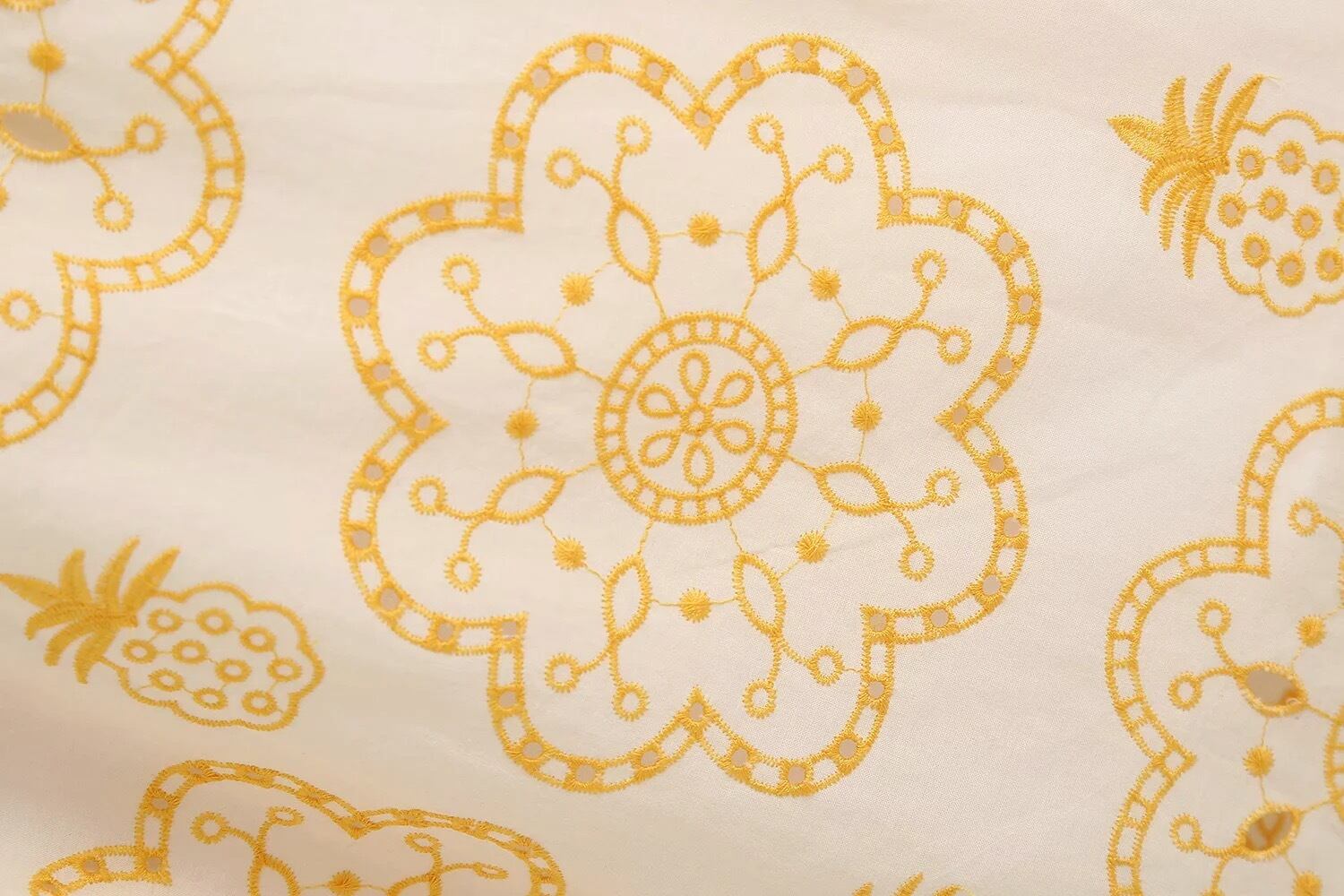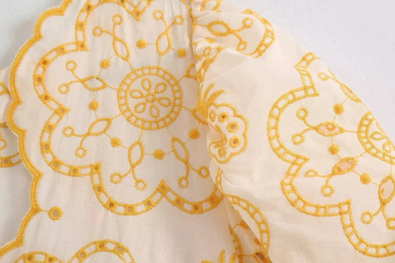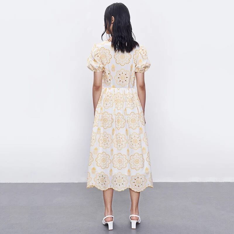 ふんわり袖にイエロー刺繍デザインのワンピース