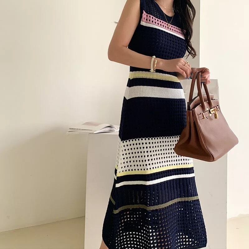エレガントナチュラルラインフレアーニットワンピース ネイビー