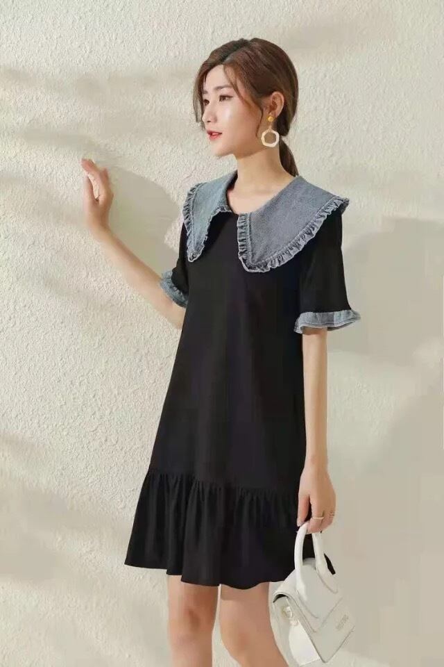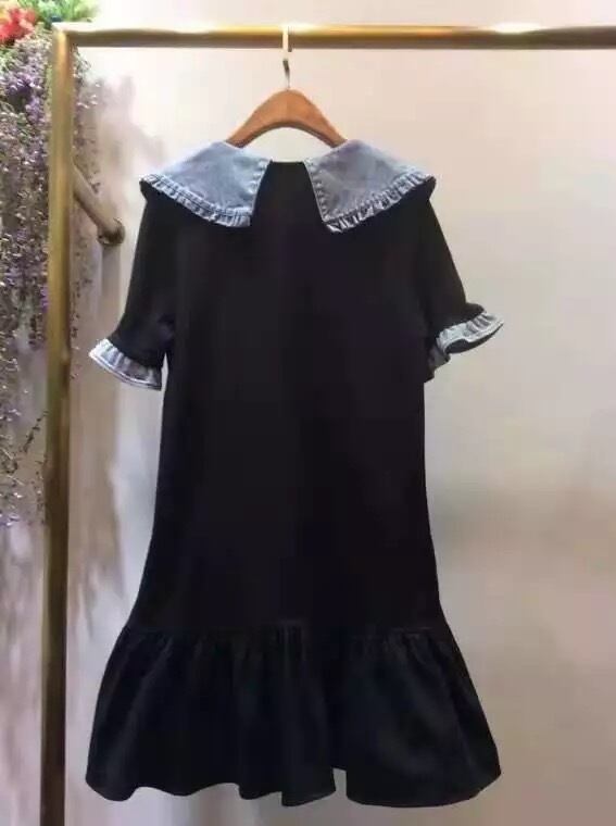 ハイクオリティ半袖デザインデニム襟ワンピース ブラック