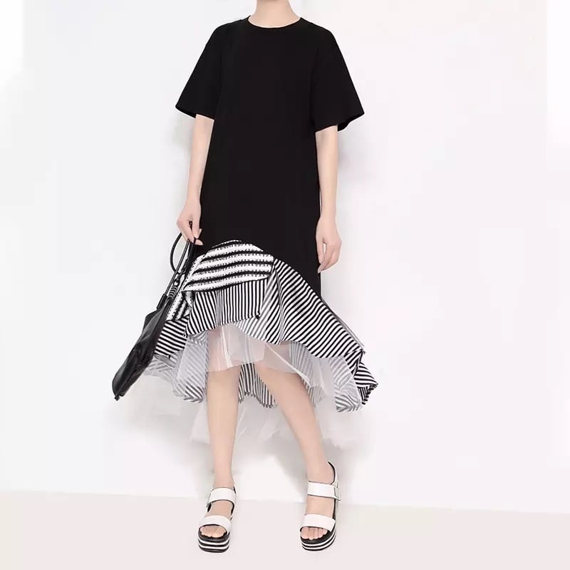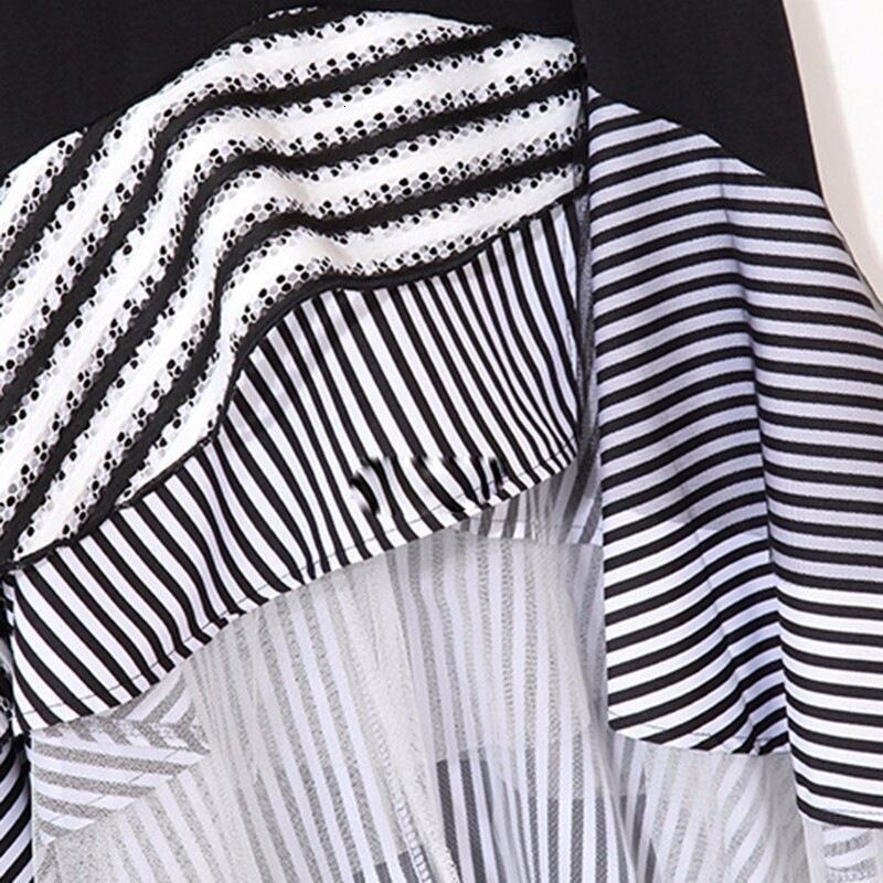 半袖ミディドレスパッチワークストライプメッシュフリルフレアアシンメトリー