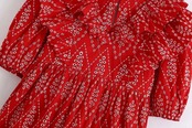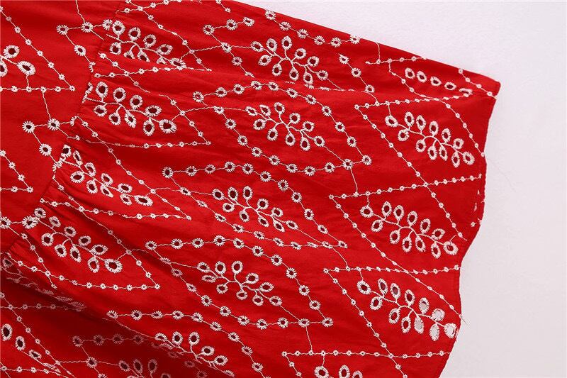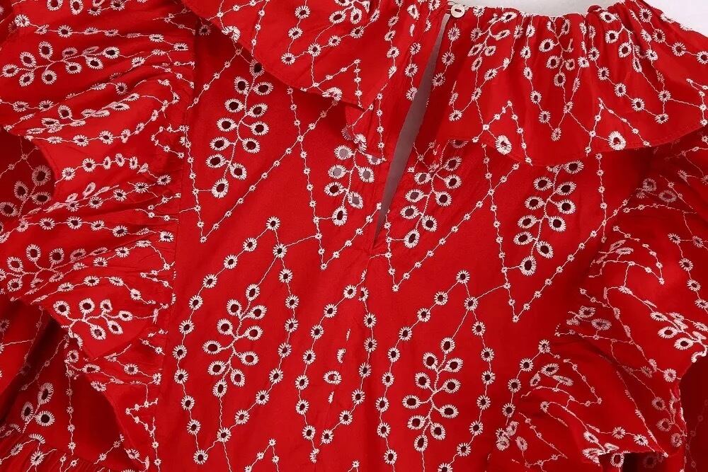 Vネックパフ刺繍フリルミディ丈ワンピース