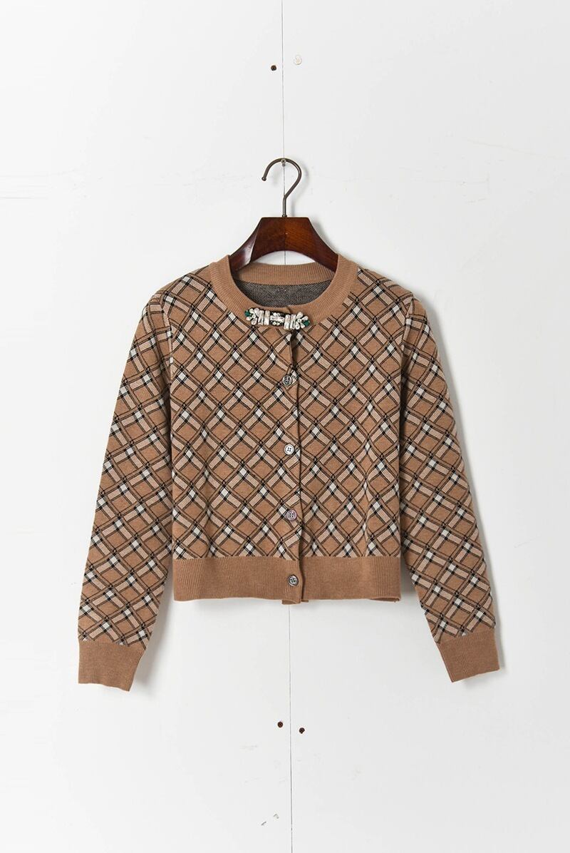 チェッククリスタルブローチ長袖カーディガン