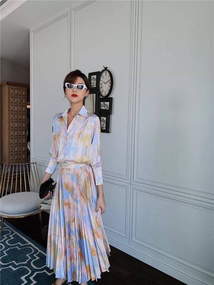 シングルブレスブラウス、プリーツスカートのセットアップです