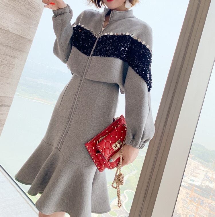 フロントジッパービジューカジュアルワンピース グレー