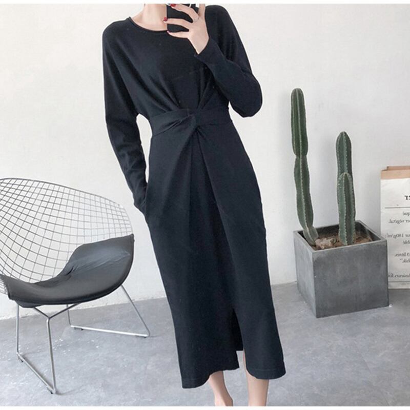 Aラインウエストリボン紐デザインニットワンピース
