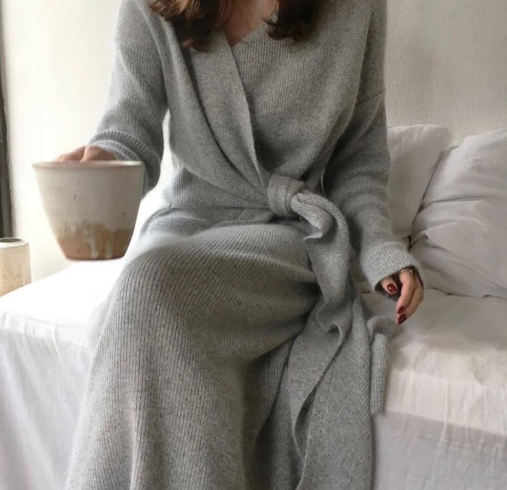 ニットミディベルトラップドレスセ V ネック長袖スプリットニットワンピース