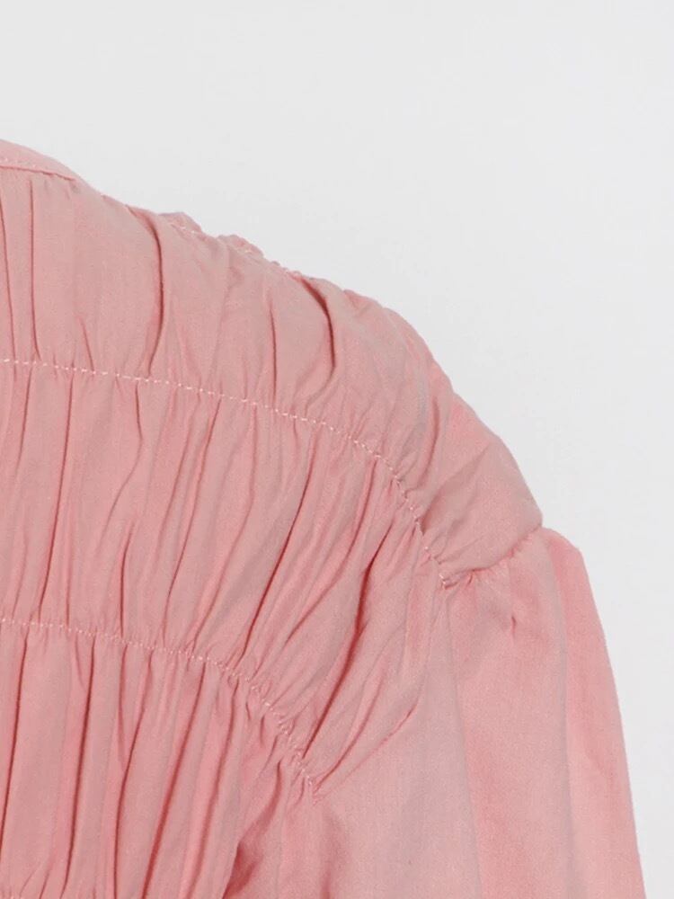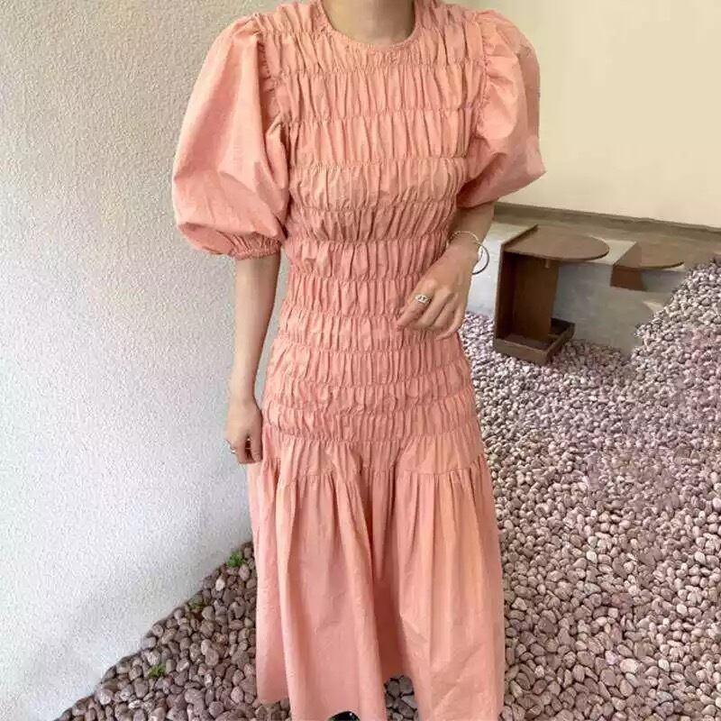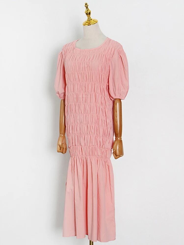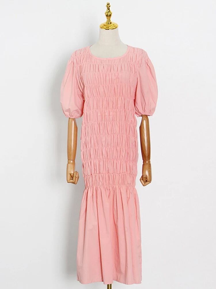 パッチワークドレス パフスリーブ ラウンドネック ミドル丈 2カラー